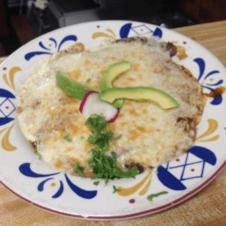 Specially prepared corn tortilla smothered with refried beans, shredded or ground beef, pork or chicken, then topped with queso cotija, lettuce, tomatoes, Ranchera sauce, sour cream and guacamole.