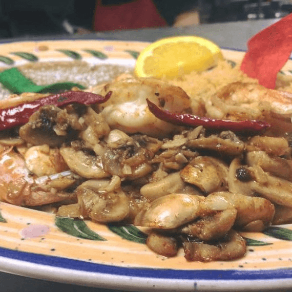 Chicken marinated in tequila, garlic, and mushrooms.
