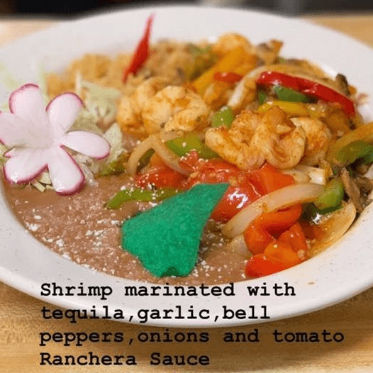 Shrimp marinated with tequila, garlic, bell peppers, onions and tomato Ranchera sauce.